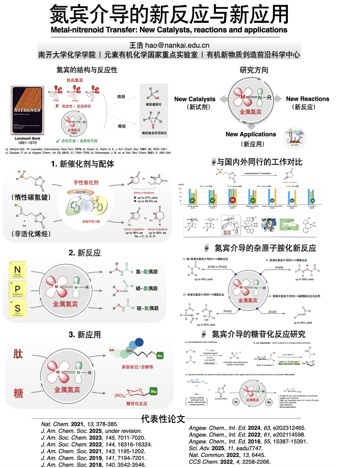 Associate Prof. Hao Wang (王浩) E-mail: hao@nankai.edu.cn Education 2018 PhD, Nankai University, China 2015 MS, Shanghai University, China 2012 BS, Shandong University of Science and Technology, China Academic career 2023-present Associate Professor (tenure-track), Nankai University, China 2021-2023 JSPS Visiting Scienist, RIKEN, Japan 2018-2021 Postdoctoral researcher, Nankai University, China Research area Nitrene Chemistry, Synthetic Organic Chemistry, Computational Chemistry, Enantioselective Synthesis. Honors Nankai University Hundred Young Academic Leaders Program, 2022 Selected Publications 1. Fan, Q., Bai, Z., He, G., Chen, G., Wang, H.* Iridium-Catalyzed Nitrene-Mediated Enantioselective 1,2-Hydride Shift Enabled by Attractive Non-covalent Interactions for Chiral δ-Lactam Synthesis. J. Am. Chem. Soc. 2025, 147, 20680–20692. 2. Zhu, S., Zhang, H., Sun, B., Bai, Z., He, G., Chen, G., Wang, H.* Nitrene-mediated Aminative N–N–N Coupling: Facile Access to Triazene 1-Oxides. Chem. Sci. 2025, 16, 6458-6467. 3. Bai, Z., Wei, Z., Zhu, S., He, G., Wang, H.,* Chen, G.* Nitrene-mediated glycosylation with thioglycoside donors under metal catalysis. Sci. Adv. 2025, 11, eadu7747. 4. Wang, H., Jung, H., Song, F., Zhu, S., Bai, Z., Chen, D., He, G., Chang, S.,* Chen, G.* Nitrene-Mediated Intermolecular N–N Coupling for Efficient Synthesis of Hydrazides. Nat. Chem. 2021, 13, 378-385.