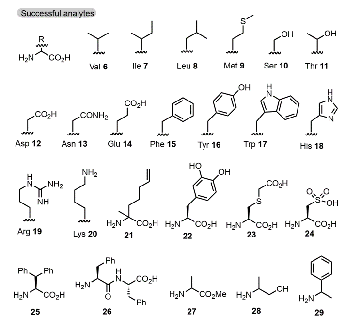 手性氨基化合物特别是 α-氨基酸是有机化学、药物化学以及材料化学等领域中重要的合成砌块。开发灵敏、便捷的方法对这类试剂进行高效精确的手性分析引起了科研人员越来越多的关注。