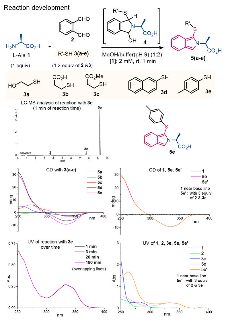 本工作首先是从对邻苯二甲醛参与的三组分标记氨基化合物这一经典的反应进行“翻新”。虽然该类反应在室温下就可以实现快速专一的衍生化反应生成在 335 nm 处强紫外吸收的硫醇取代异吲哚结构,但是这个结构本身在室温下较容易氧化降解从而降低紫外吸收。同时,常使用的乙二硫醇,巯基丙酸等巯基试剂具有强刺激性气味给整个操作带来不便。作者通过对巯基试剂的筛选,发现使用对甲基硫酚可以很大程度上弥补上述缺陷同时还带来了效果的提升。首先,对甲基硫酚可以保持反应的极快速转化生成异吲哚衍生物(1-3 分钟),反应高效专一且体系干净;其次,生成的异吲哚结构的稳定性大大提高,空气中放置超过 12 个小时都不会发生分解;更为重要的是,相比其他巯基试剂,对甲基硫酚参与形成的异吲哚结构具有更强的 CD 信号,而且其自身紫外吸收弱,即使大大过量也不会对产物的 UV 和 CD 信号产生干扰(图 5)。